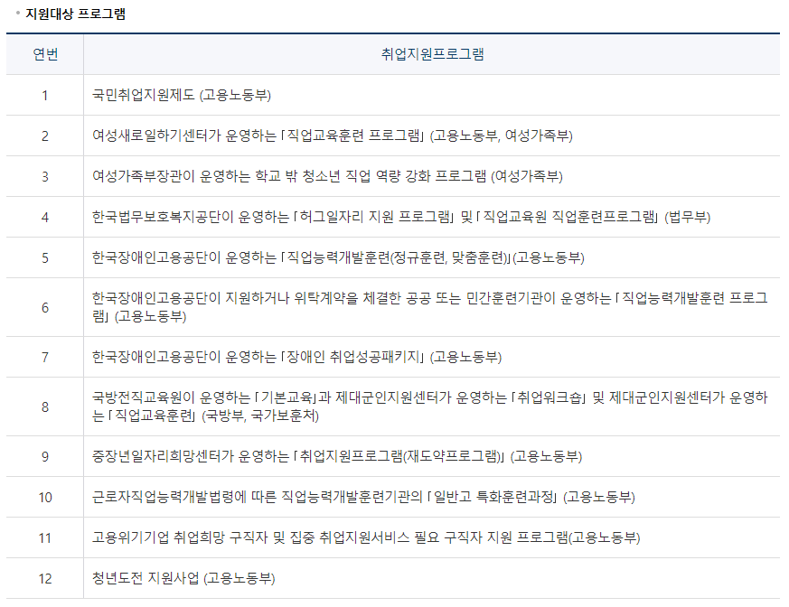 *특정 대상자 : 국민취업제도의 취업서비스 수급자격을 인정받은 사람 중 기초생활수급자, 취업지원프로그램 이수면제자 중 중증장애인, 가족부양의 책임이 있는 여성으로 1개월 이상 실업상태에 있는 사람