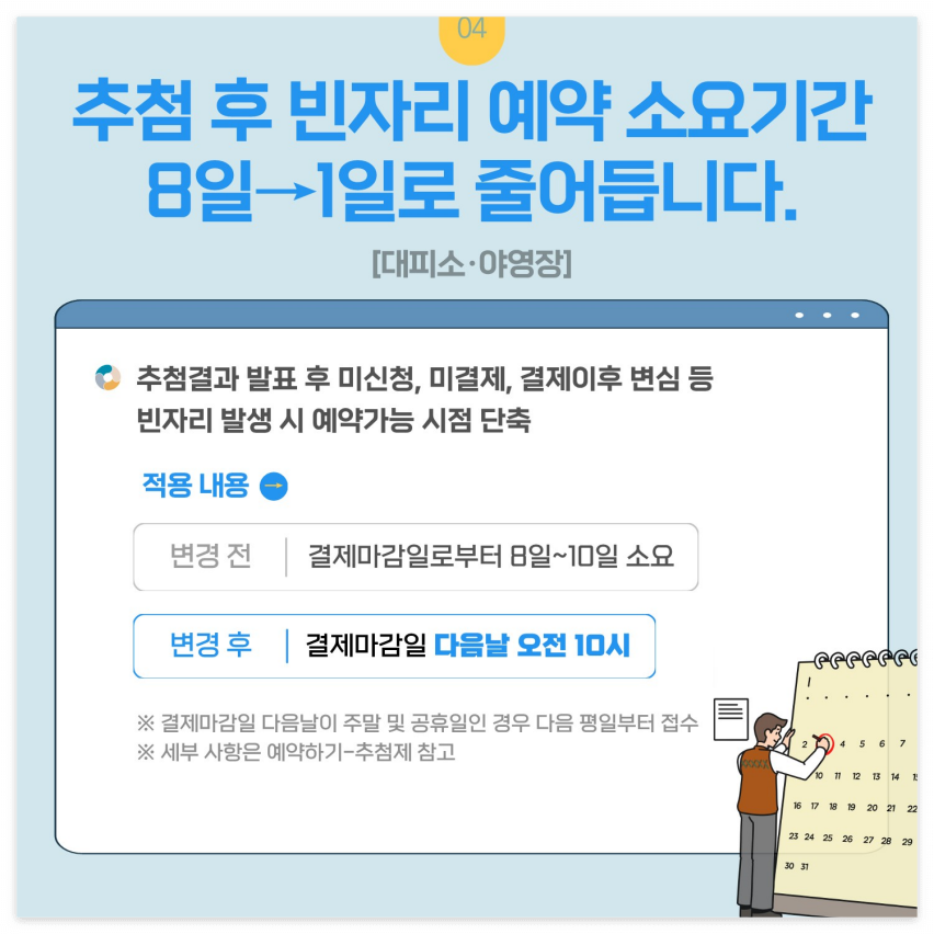 - 빠른 예약 진행: 인기 시설은 예약이 빠르게 마감되므로, 예약 시작 시간에 맞춰 빠르게 진행하세요.