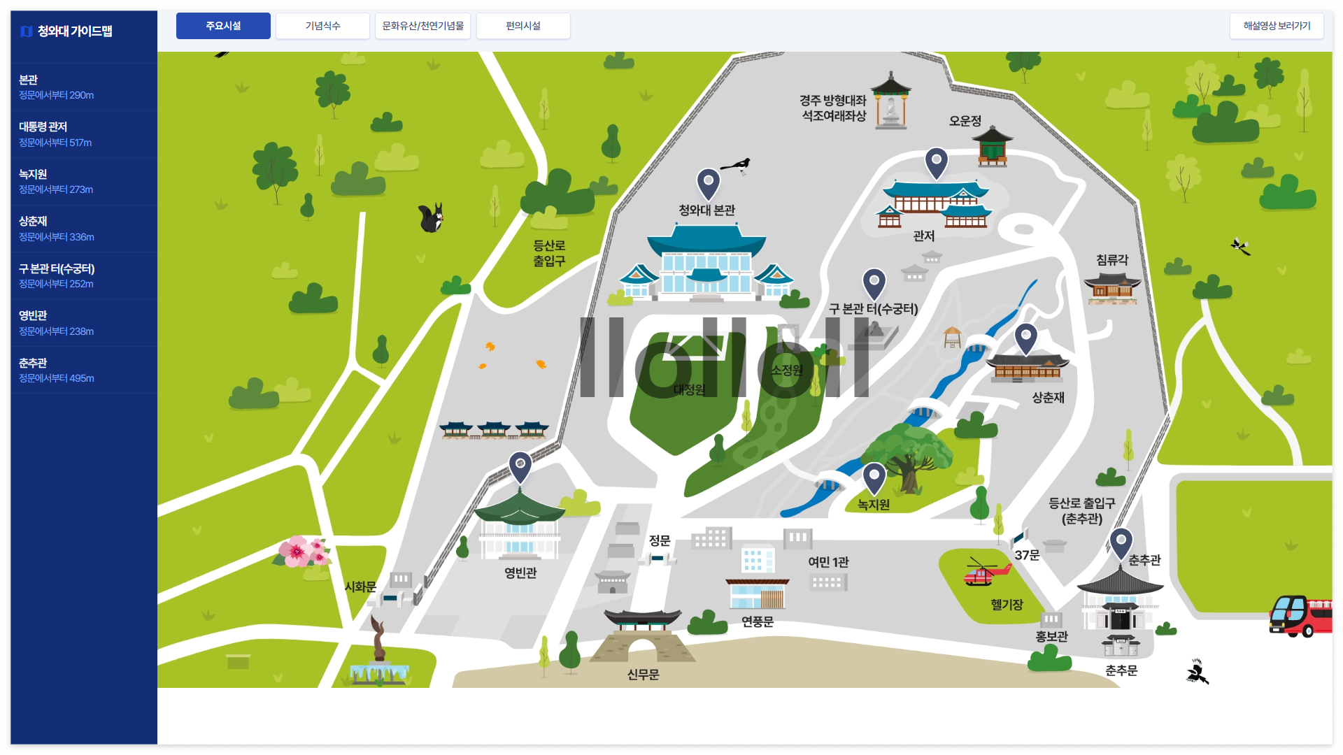 A. 청와대 가이드맵 참고했습니다. 입구에서 청와대 설명서와 지도도 배치되어 있기 때문에 사전에는 온라인으로 탐색해 보고 현장에서 지도를 들고 다녔는데 정확하게 돼있어서 관람하는데 도움 됐어요!