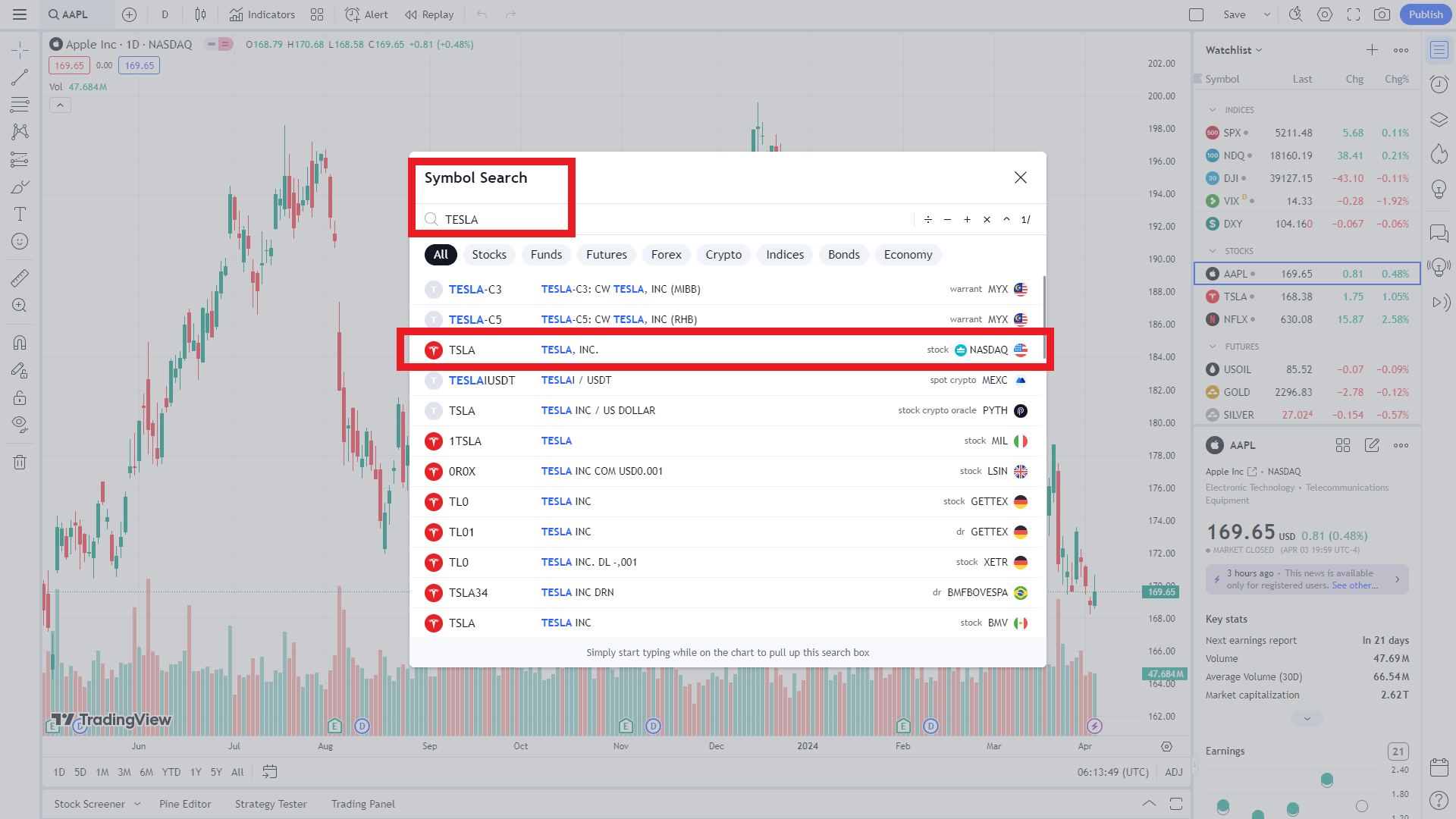 - 이름(TESLA)과 티커(TSLA)가 일치하는지 확인하고 발표기관이 stock/NASDAQ인 점을 확인 후 선택