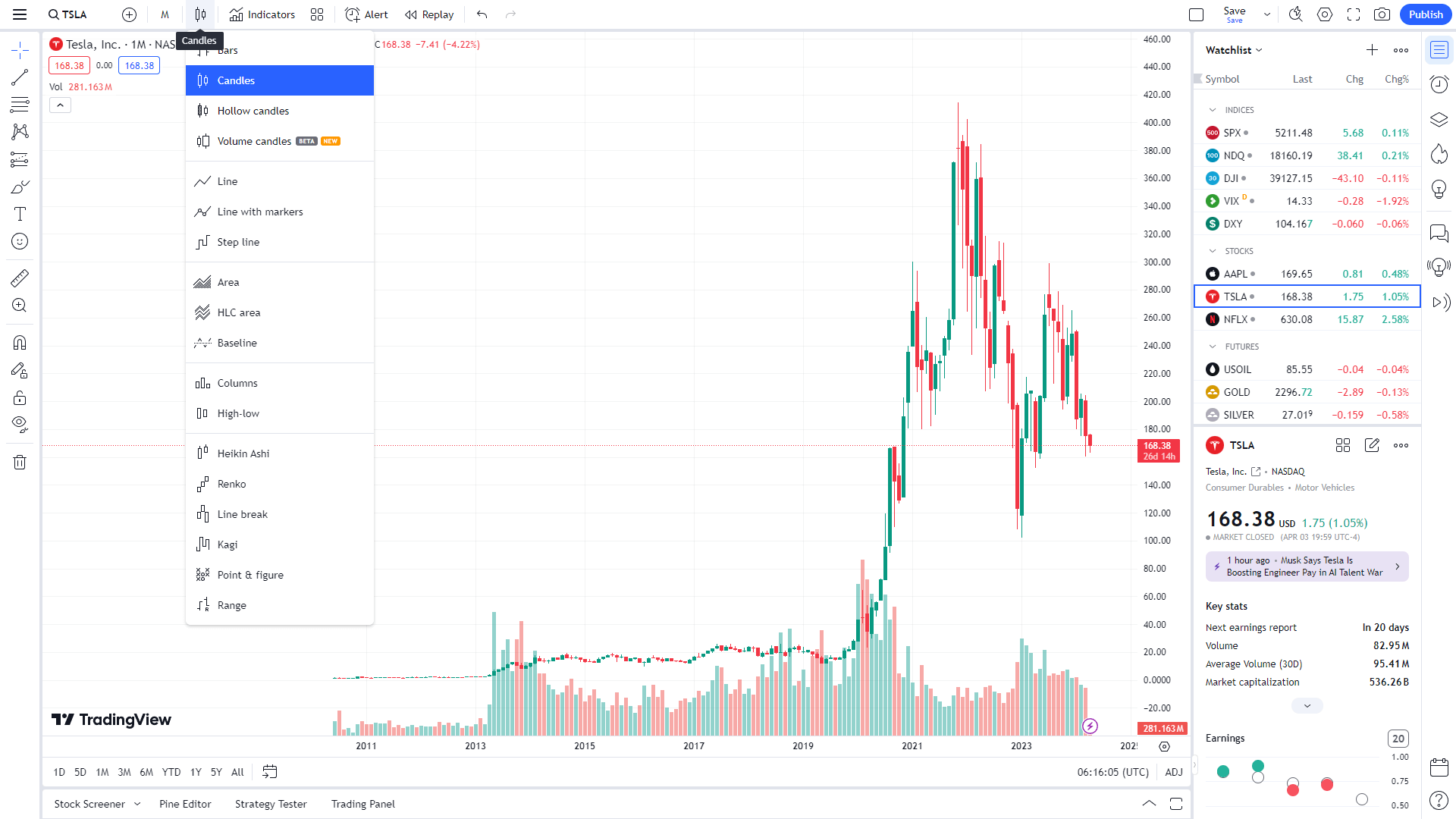 캔들을 변경하여 원하는 차트의 형태로 설정할 수 있습니다. 캔들, 라인, 영역 차트 등 다양한 모습으로 활용하며, 가장 기본적으로는 캔들차트를 사용합니다.