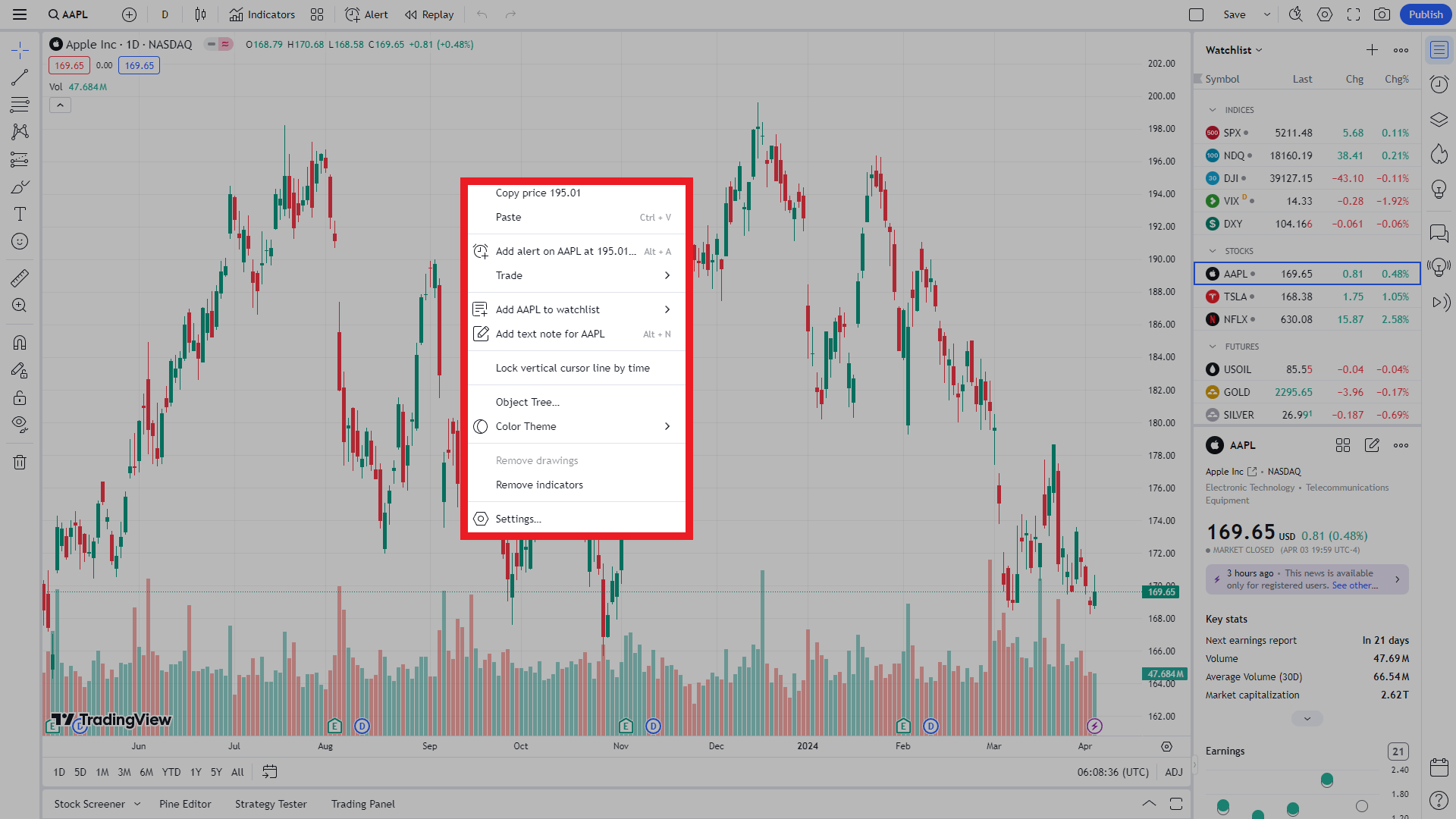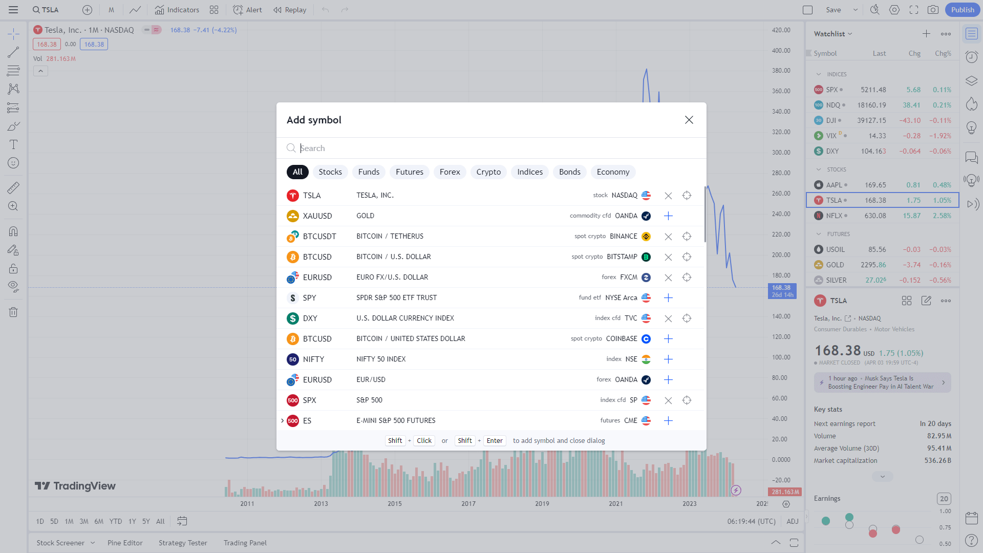 우측 상단에서는 해당종목 외에 내 계정에 즐겨찾기목록을 편집할 수 있습니다. +버튼을 이용해 추가할 수 있으며, 해당종목을 선택해서 우클릭하면 왓치리스트에서 제외할 수 있습니다. 글로 벌리 하게 가장 많이 추가하는 종목은 다음과 같습니다. 금(GOLD), 테슬라(TSLA), 비트코인(BTC/USDT), S&P500(SPY), 달러인덱스(DXY), 애플(APPL)