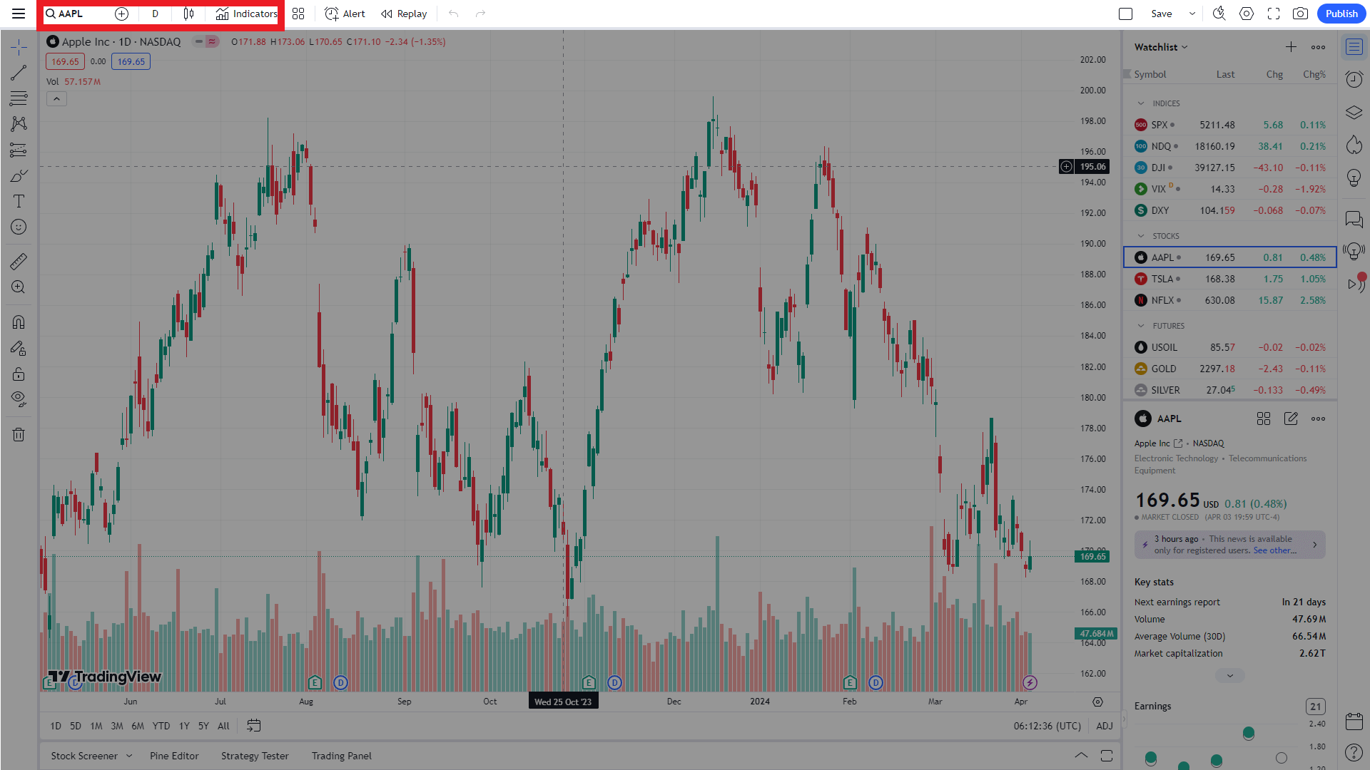 인디케이터(지표) : 각종 보조지표를 추가할 수 있습니다. 가장 많이 사용하는 보조지표는 다음과 같습니다. 볼린저밴드, 상대강도지수(RSI), 이동평균수렴(MACD), 가격이동평균(MA), 지수이동평균(EMA)