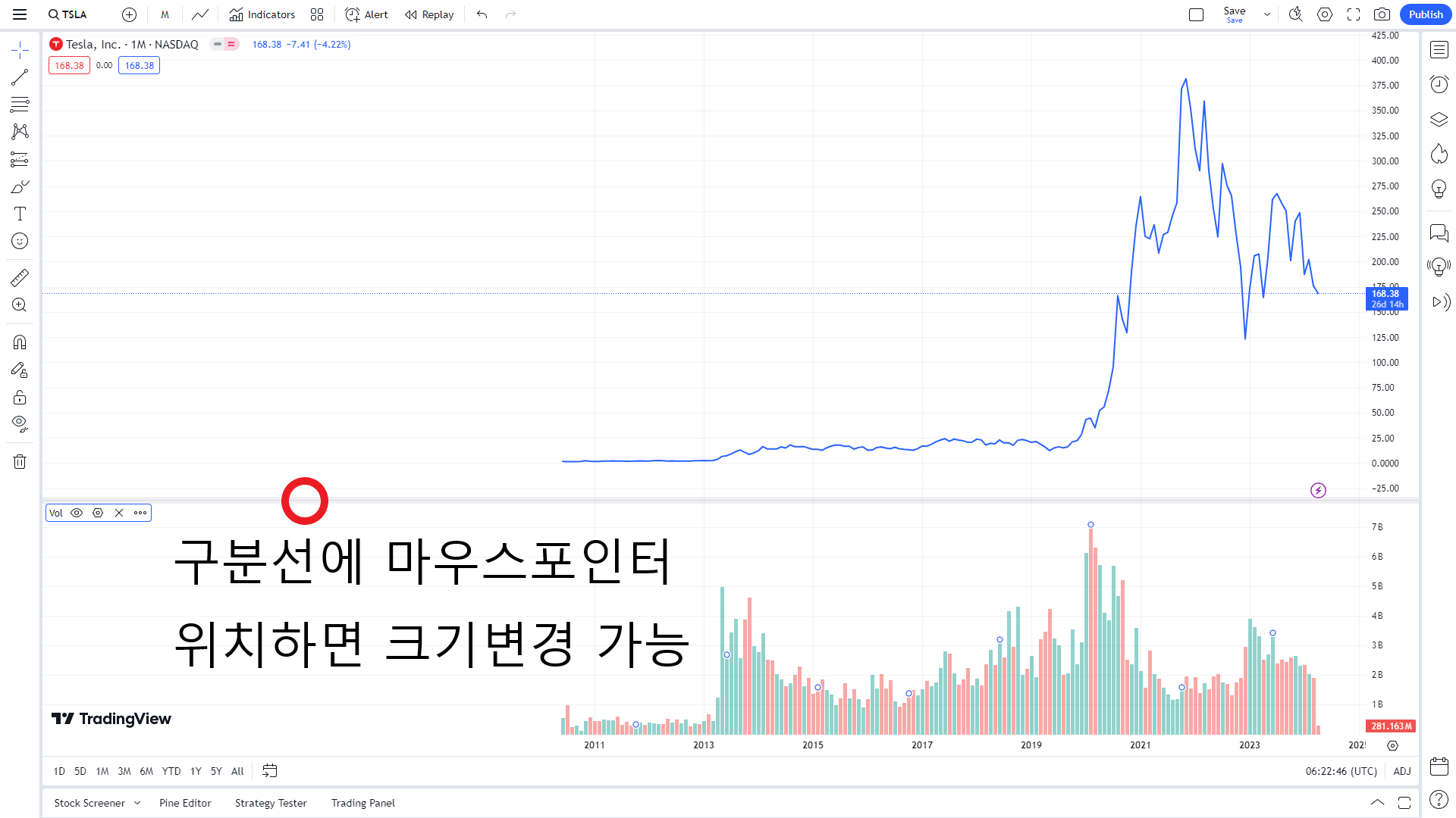 - 거래량을 메인차트와 분류해 하단에 위치하고, 해당 페인에 RSI지표 추가