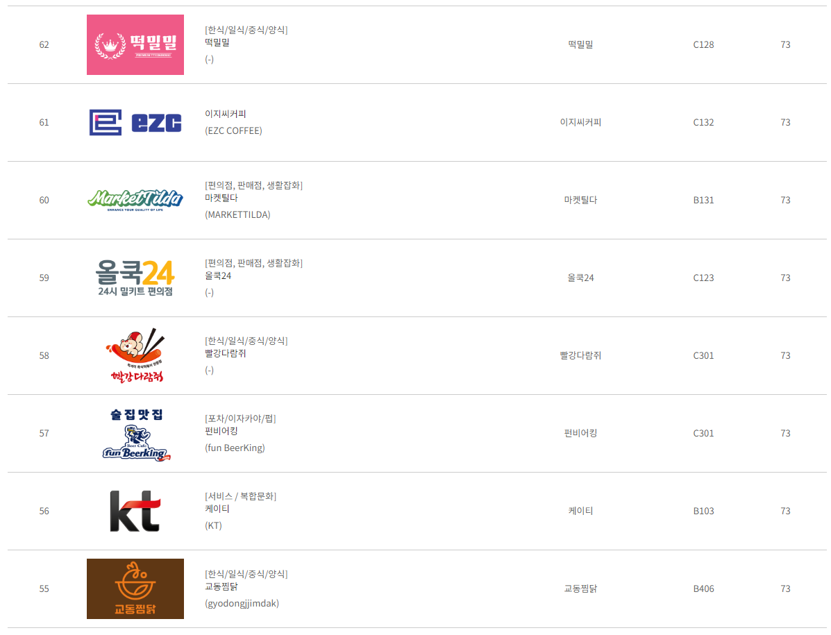 참가업체들의 사업분야들로는 5개의 카페 프랜차이즈를 비롯해, 21개 식당, 2개 스터디카페, 4개 치킨 및 피자, 3개 제과제빵, 2개 술집, 13개 서비스, 6개 편의점 및 생활잡화, 1개 밀키트, 1개 언론매체 등이 참가하였으며, 대중적으로 가장 많이 창업하는 분야인 요식업 분야의 참가업체가 가장 많이 있습니다. 이를 통해 막무가내로 치킨집이나 술집, 식당에 대한 창업보다는 비교적 많은 브랜드를 접하여 탐구함으로써 다양한 정보를 취합하여 창업에 관심이 있는 분들에게 도움이 될 수 있으며, 창업박람회는 4월 초 3일간 열리는 만큼 시간조율을 통해 참가하시길 권장드립니다.