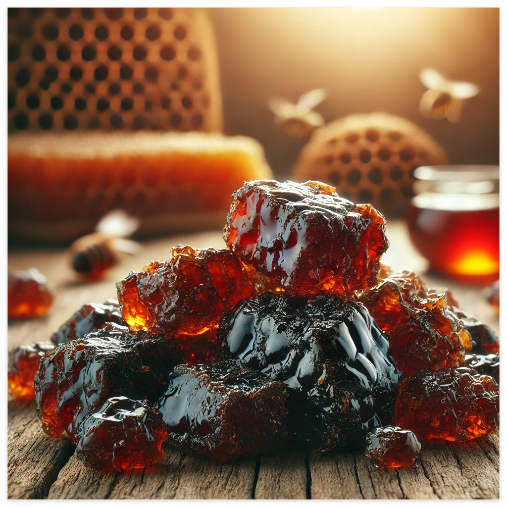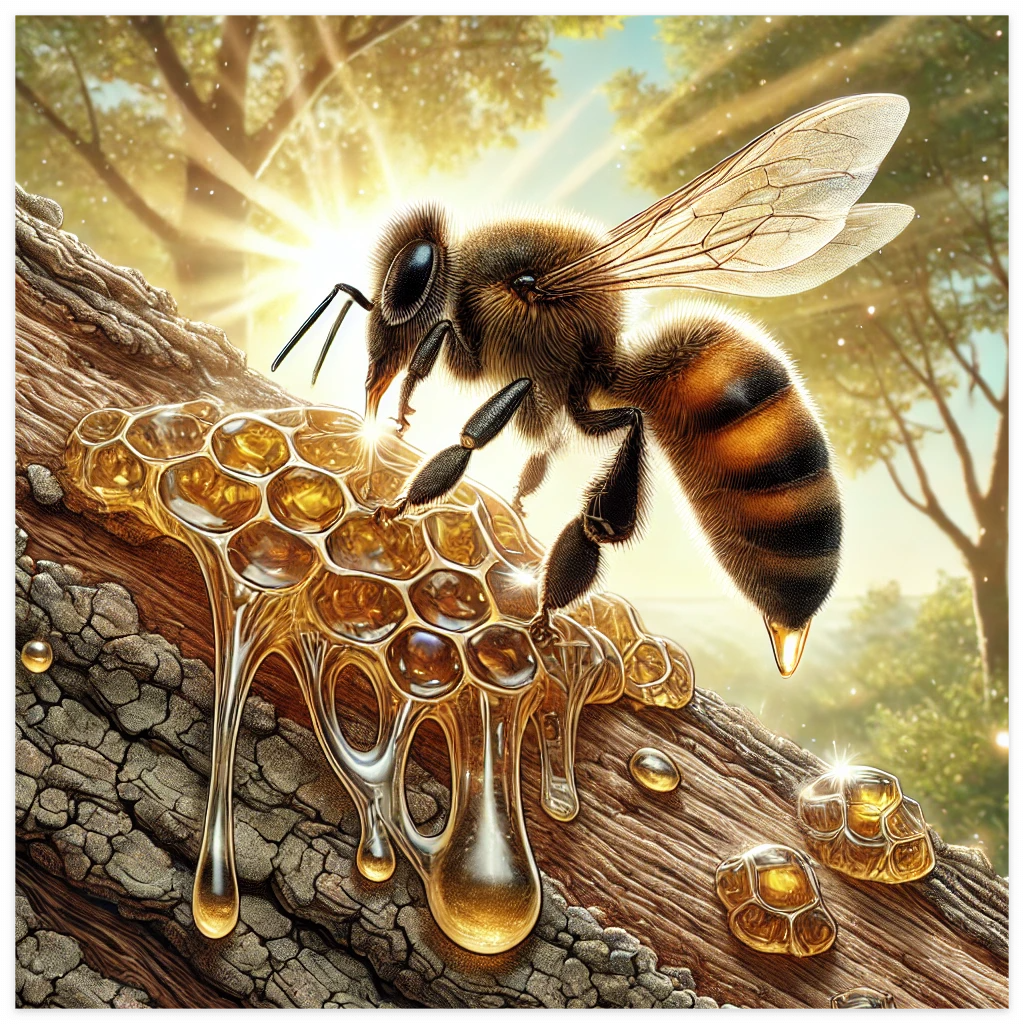 프로폴리스(Propolis)는 벌이 나무의 수액, 꽃가루, 자신의 타액 등을 혼합하여 만든 천연 물질로, 벌집을 보호하는 역할을 합니다. 벌들이 이 물질을 벌집의 틈새를 메우는 데 사용하여 외부 침입을 방지하며, 세균이나 곰팡이 같은 병원체로부터 벌집을 안전하게 유지하는 기능을 합니다.