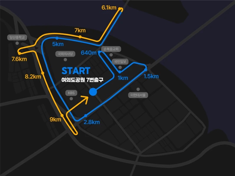 - 코스: 서울 여의도공원 출발, 서강대교, 광흥창역, 합정역 등을 지나는 코스