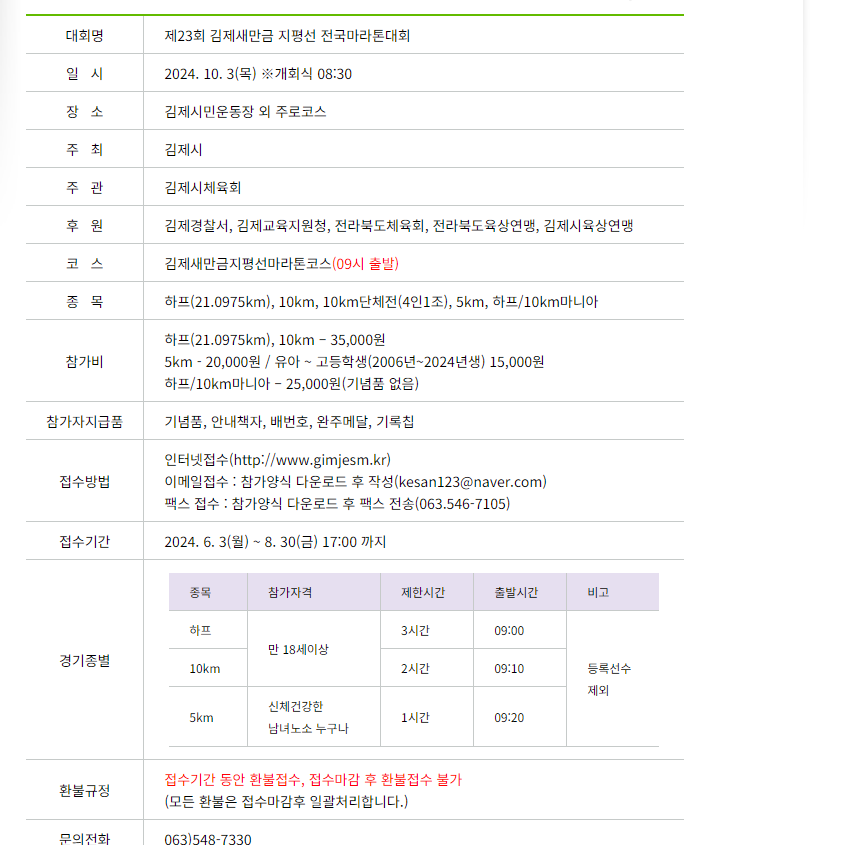 - 기타 정보: 김제새만금 지평선 마라톤 대회는 김제시의 아름다운 농촌 경관을 배경으로 펼쳐지며, 참가자들은 넓은 평야를 달리며 가을의 정취를 만끽할 수 있습니다. 대회 후에는 지역 특산물인 지평선 햅쌀을 완주자에게 제공하여 참가자들의 만족도를 높이고 있습니다.